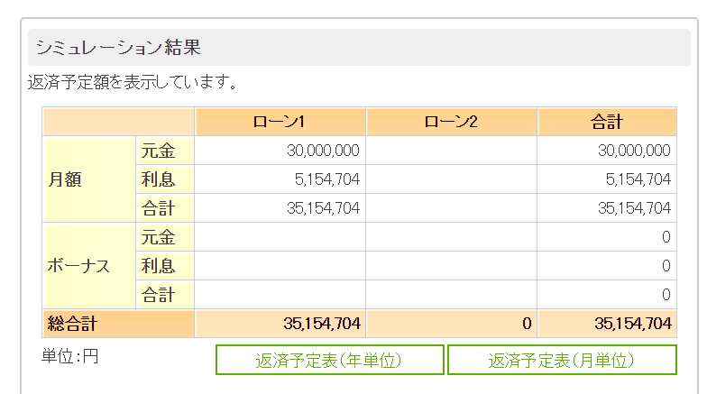 ローン計算ツールで計算するとこのようになりました(ややこしいのでボーナスはなし)。金利は2018年7月現在の都市銀行の平均(約1.3%)で計算しています。